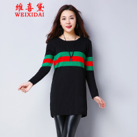 维喜黛新款大码女装胖mm200斤中长款撞色拼接长袖针织衫套头毛衣打底连衣裙
