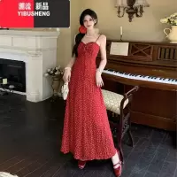 YIBUSHENG港味辣妹风红色波点挂脖连衣裙女季性感大露背气质收腰V领短裙