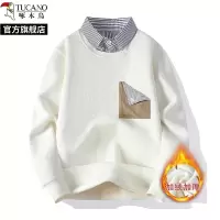 啄木鸟春秋冬季新款衬衫领假两件长袖套头厚棉T男士加绒大尺码打底衫
