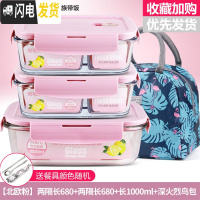 三维工匠上班族耐热玻璃饭盒微波炉专用便当盒收纳女保鲜盒密封碗套装 [北欧粉]两隔长680+经典深火烈鸟包