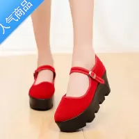 SUNTEK松糕底防水加厚特高跟增高平绒一字扣女单鞋黑色工作鞋