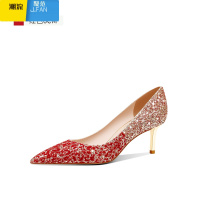 聚范婚鞋秀禾服婚纱两穿水晶鞋新娘鞋女红色尖头高跟鞋粗跟不累脚单鞋