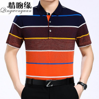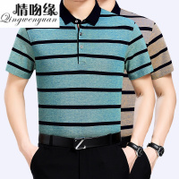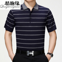 情吻缘2018夏季高质量桑蚕丝男士短袖翻领条纹T恤衫商务爸爸装