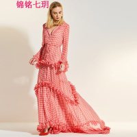锦铭七玥欧美新款格纹花边深V领连衣裙长裙拖地晚礼服女