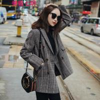 锦铭七玥韩版格纹修身西装女外套长袖中长款双排扣休闲百搭西服