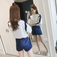 薇侣2017新品夏季新款韩版不对称长袖撞色上衣+纯色阔腿短裤两件套女