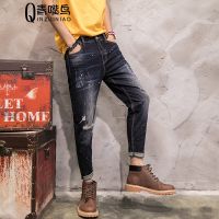 尊首新款20172017新款牛仔裤男士九分裤春夏哈伦日系修身小脚裤破洞印花9分裤780黑蓝