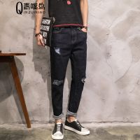 尊首新款20172017春夏新款时尚水洗男士破洞9分牛仔裤子韩版青少年直筒九分裤773黑蓝