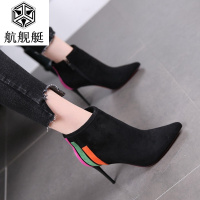细跟短靴女绒面条纹拼色高跟鞋2017秋冬新款马丁靴百搭尖头及裸靴