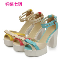 锦铭七玥夏季粗跟防水台韩版甜美蝴蝶结高跟鞋拼色女一字扣带凉鞋