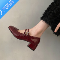 SUNTEK酒红色玛丽珍单鞋女设计感小众方头浅口漆皮法式复古粗跟高跟鞋女