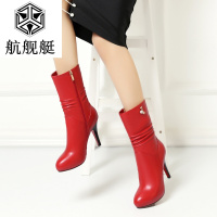 真皮靴子女 中筒靴裸靴棉鞋防水台酒杯跟水钻红色高跟中靴