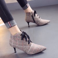 2017秋冬新款小香尖头短靴女细跟裸靴系带呢子千鸟格高跟鞋马丁靴