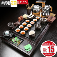 三维工匠紫砂功夫茶具套装家用客厅简约陶瓷茶杯壶茶台乌金石实木茶盘 黑陶侧把套装+行云流水盘 18件