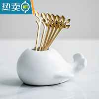 敬平鲸鱼陶瓷罐果叉套装创意可爱北欧风格叉子家用不锈钢水果签果插 白色鲸鱼罐一个+6根树叶叉