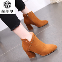 欧美铆钉侧拉链女靴2017新款磨砂真皮短靴女粗跟高跟鞋百搭及裸靴