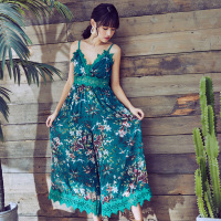 珂依舍2018春夏装新款春夏装V领吊带连衣裤碎花波西米亚度假沙滩阔腿裤裙