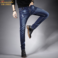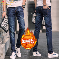 男士牛仔裤加绒加厚深蓝色初中学生秋冬款男土瘦腿收脚裤男裤子潮