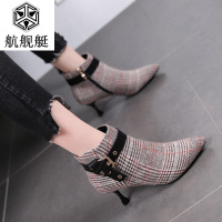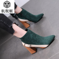 铆钉皮带扣中高跟短靴女马丁靴2017秋冬新款尖头裸靴女细跟高跟鞋