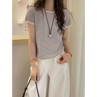 25夏季新款圆领细条纹冰丝短袖女百搭显瘦T恤针织衫上衣薄款内搭