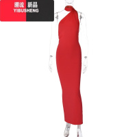 YIBUSHENG性感大露背斜肩飘带设计连衣裙时尚辣妹抽褶包臀收腰拖地单肩长裙