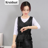 Kruidvatpu皮马甲女韩版春装新款套头背心马夹荷叶边短款无袖V领收腰上衣M6
