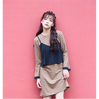 YIBUSHENG日系[茜茜女孩]艺术感竖条纹小众褶皱圆领两穿连衣裙胸136长107