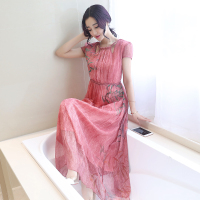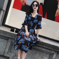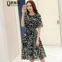 步来褶惠夏季圆领喇叭袖碎花中长款女式雪纺连衣裙新甜美夏