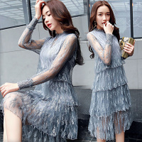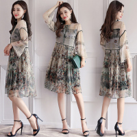 莞馨五分袖碎花甜美2017年夏季连衣裙两件套宽松中长款开衫圆领