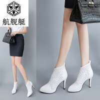 欧美真皮靴子女高跟短靴春秋及踝靴马丁靴镂空单靴夏凉靴裸靴白色