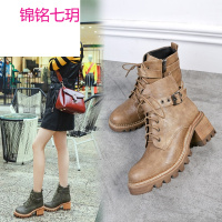 锦铭七玥女鞋2018春夏季新款加绒马丁靴女防水台系带短靴实木粗跟靴子