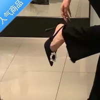 SUNTEK2023年春款法式后绊带黑色尖头高跟鞋水钻方扣细跟小众配裙子单鞋