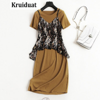 Kruidvat2017夏季新款复古T恤式不规则中裙+碎花编制皮绳肩带花色