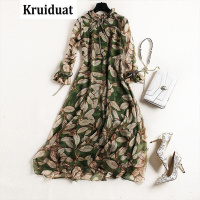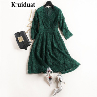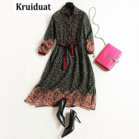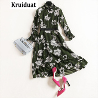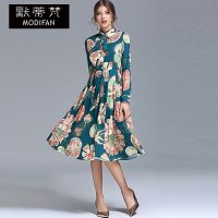 Kruidvat2017春季新款女装印花翻领开衫中长袖大摆连衣裙B075绿色