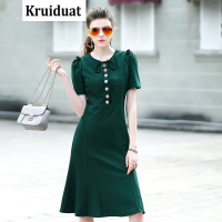 Kruidvat2017春季新款修身木耳花边大摆短袖连衣裙LT绿色7粒扣木耳花边裙