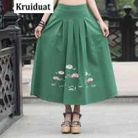 Kruidvat文艺森系棉麻半身裙2017春新款绣花a字裙大摆长裙百褶裙HW绿色均码