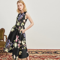 奥芝国 优雅ROSE 18春 黑色鲜花印花修身A字伞裙高腰中长裙连衣裙