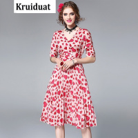 Kruidvat2017夏季新款心形印花V领系带中长裙收腰连衣裙玫红色