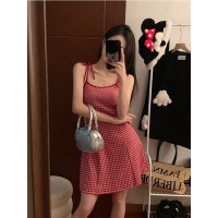 YIBUSHENG甜美风红色格子连衣裙女季小个子吊带裙小众减龄修身A字裙短裙