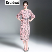 Kruidvat甜美女装圆领荷叶袖印花雪纺开叉一步长裙M027粉红色
