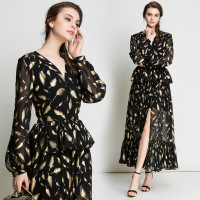 欧美秋新款气质复古长袖荷叶边烫金印花雪纺连衣裙开叉长裙女