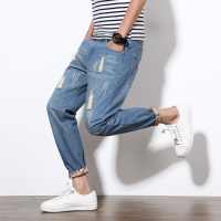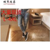 春季新款破洞牛仔裤男士加肥大码九分裤小脚裤韩版青年潮流男裤子