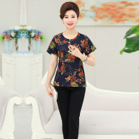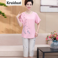 Kruidvat中老年女短袖棉麻套装民族风印花女式休闲两件套Z029