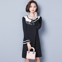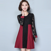 女秋装2017新款大码显瘦藏肉长袖连衣裙胖妹妹蕾丝拼接打底裙减龄