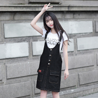 薇侣2017新品&钱夫人CHINSTUDIO定制复古单排扣连衣裙女夏高腰显瘦牛仔背带裙