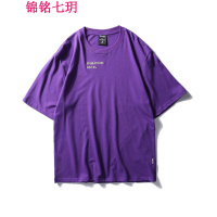 锦铭七玥国潮港风街头中字长生不老刺绣圆领短袖情侣男女T恤紫色ins上衣