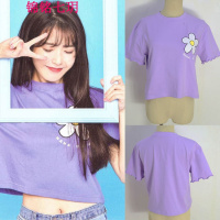 锦铭七玥IU李知恩2018夏季新款同款香芋紫色圆领套头花朵字母短袖棉T恤