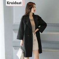 奈琴尔2017秋季新款韩版宽松中长款双排扣风衣翻领女式外套女风衣 黑色 M
