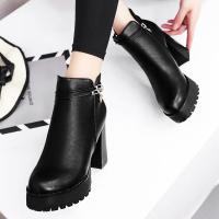 红蜻蜓女鞋高跟尖头短靴女冬季新款保暖女靴加绒黑色女鞋韩版百搭OL通勤切尔西短靴