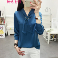 锦铭七玥2017春秋新款修身蝴蝶结雪纺衫衬衣女长袖百搭系带V领打底衫衬